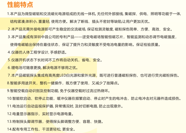 本磁探仪是单体多功能, 充好电后, 可完成所有磁粉探伤工作